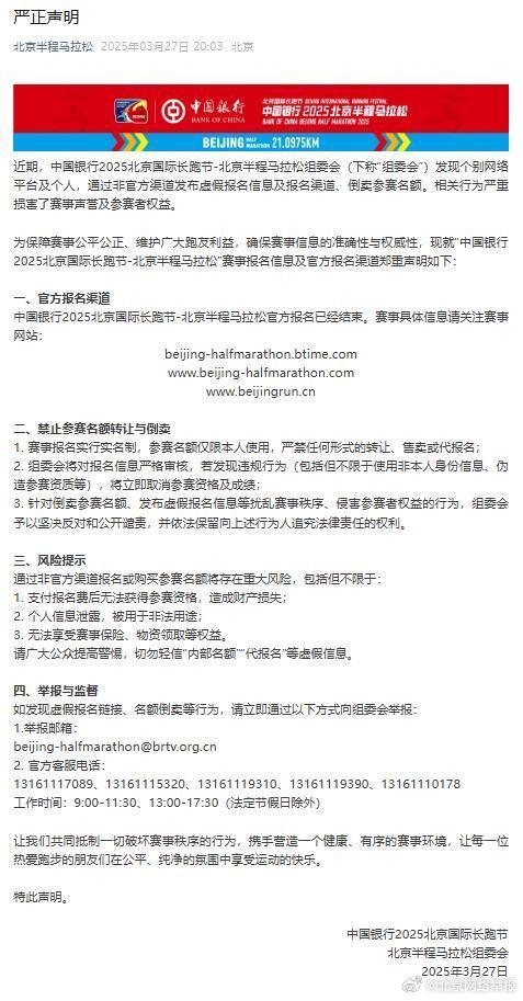 近期,中国银行2025北京国际长跑节-北京半程马拉松组委会(下称“组委会”)发现个别网络平台及个人,通过非官方渠道发布虚假报名信息及报名渠道、倒卖参赛名额。相关行为严重损害了赛事声誉及参赛者权益。为保障赛事公平公正、维护广大跑友利益,确保赛事信息的准确性与权威性,中国银行2025北京国际长跑节北京半程马拉松组委会发布郑重声明↓↓↓